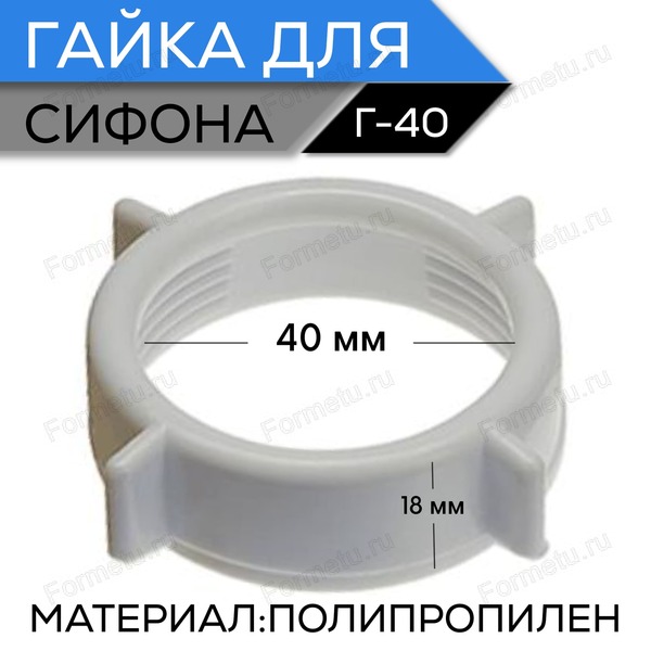 Гайка для сифона Г-40 для ремонта сифонов и гибких труб. Внешний диаметр 54 мм, внутренний диаметр 43 мм, высота 18 мм.