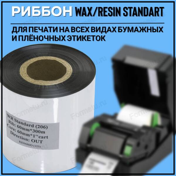 Термотрансферная лента Воск/Смола Стандарт на основе высококачественной смеси воска и смолы применяется для печати на различных видах этикеток. Данный материал позволяет делать супер-четкие отпечатки с ровными краями. Риббоны из смеси воска и смолы лучший выбор, если необходимым условием является долговечность отпечатанной информации, т.к. этот материал не только устойчив истиранию, но и защищен от УФ-излучения.
